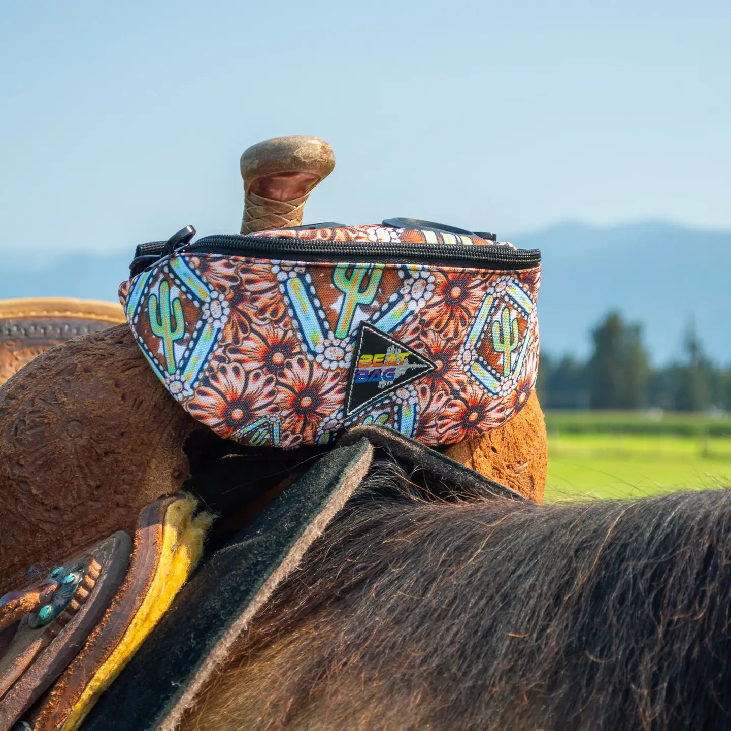 The ultimate riding accessory is here! The Beat Bag is a saddle pouch equipped with 2 rechargeable blue tooth speakers ready to play your music or to amplify your coaches voice while riding. The Beat Bag is insulated front and back to keep your items safe while riding, has 2 nylon straps with clips to attach to your saddle pommel, 2 clips to clip to your belt loops or english saddle. The bluetooth speakers easily connect to your device by selecting "Beat Bag" in the bluetooth options, and comes with USB cord to recharge the speakers. Use while riding, biking or running or any other activity that needs a beat!