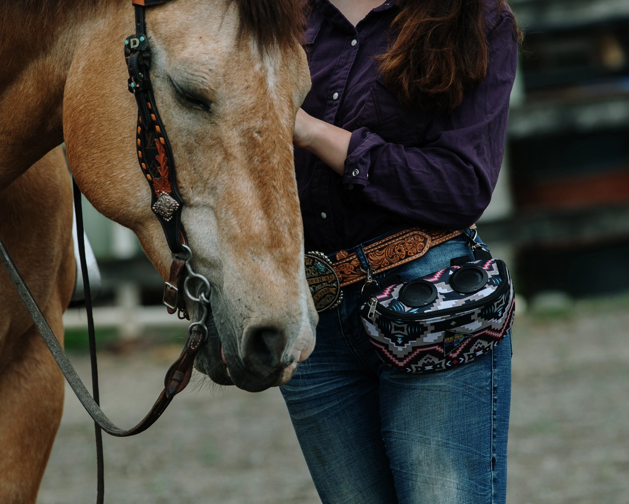 The ultimate riding accessory is here! The Beat Bag is a saddle pouch equipped with 2 rechargeable blue tooth speakers ready to play your music or to amplify your coaches voice while riding. The Beat Bag is insulated front and back to keep your items safe while riding, has 2 nylon straps with clips to attach to your saddle pommel, 2 clips to clip to your belt loops or english saddle. The bluetooth speakers easily connect to your device by selecting "Beat Bag" in the bluetooth options, and comes with USB cord to recharge the speakers. Use while riding, biking or running or any other activity that needs a beat!