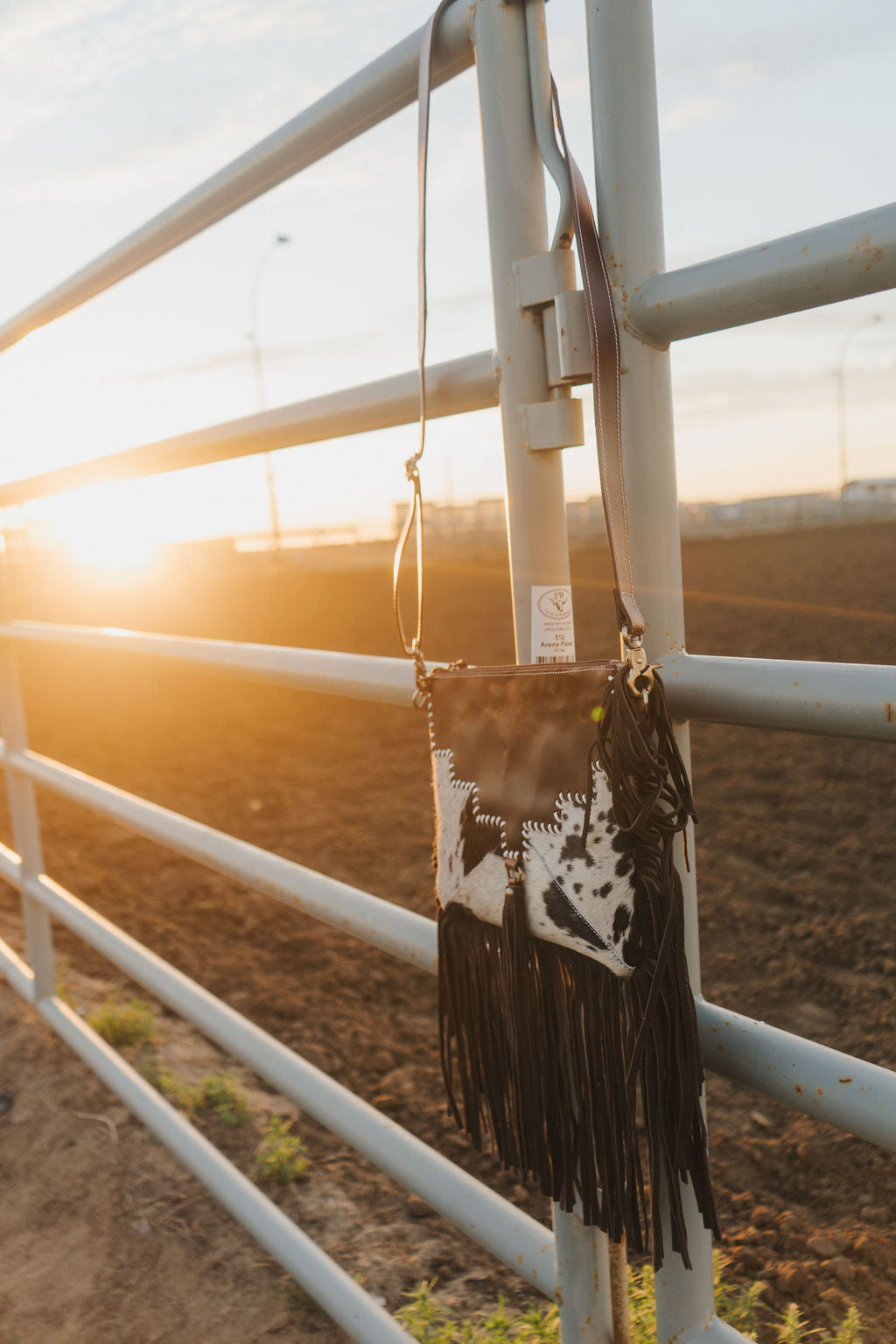 Expertly crafted with a blend of grit and glam, the Roper Cowhide Purse by Countryside Co. features a front panel of durable cowhide and leather, accented with intricate leather stitching. The leather back adds a touch of elegance to this functional and stylish accessory. Measures 11 inches by 9 inches. Each is made with unique cowhides so no two alike.